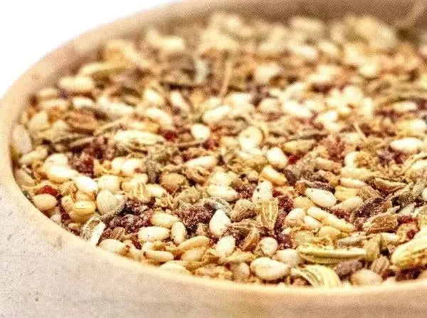 Graines de sésame, sumac, graines de coriandre, origan, thym, anis et fenouil.